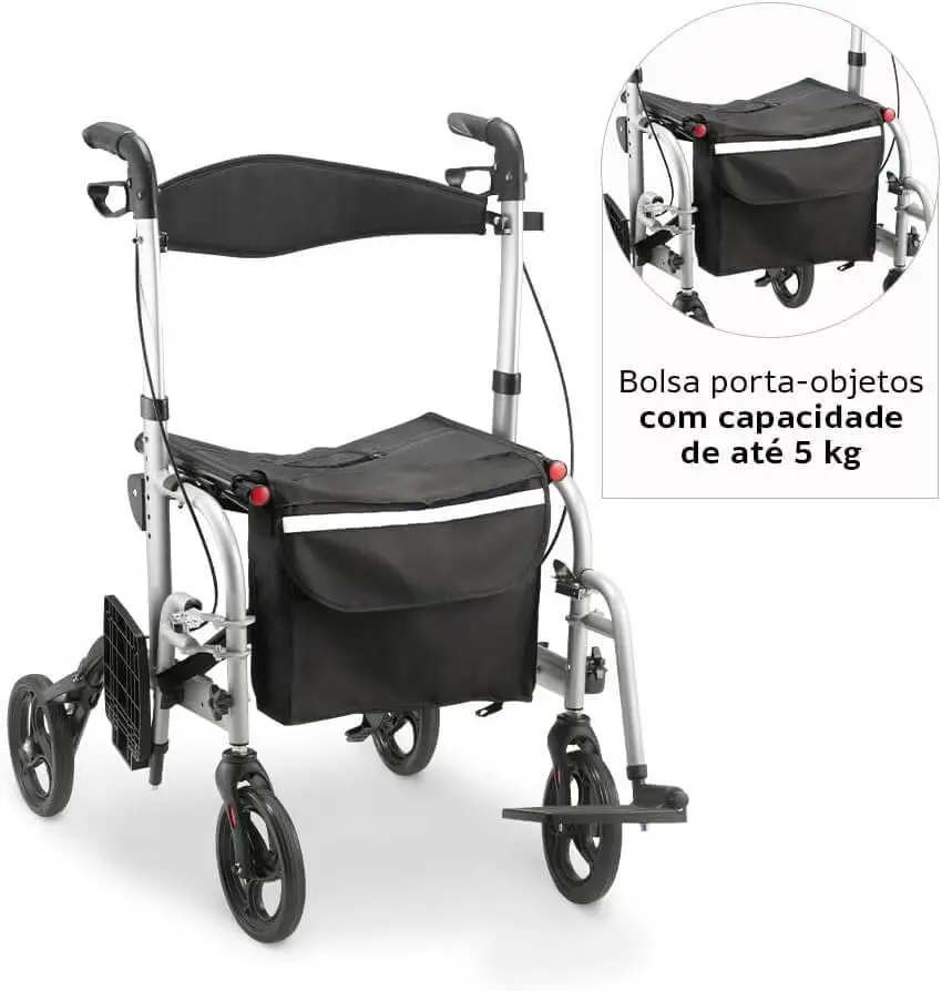 É um andador 2 em 1: Pode ser usado como andador e como cadeira de transporte.