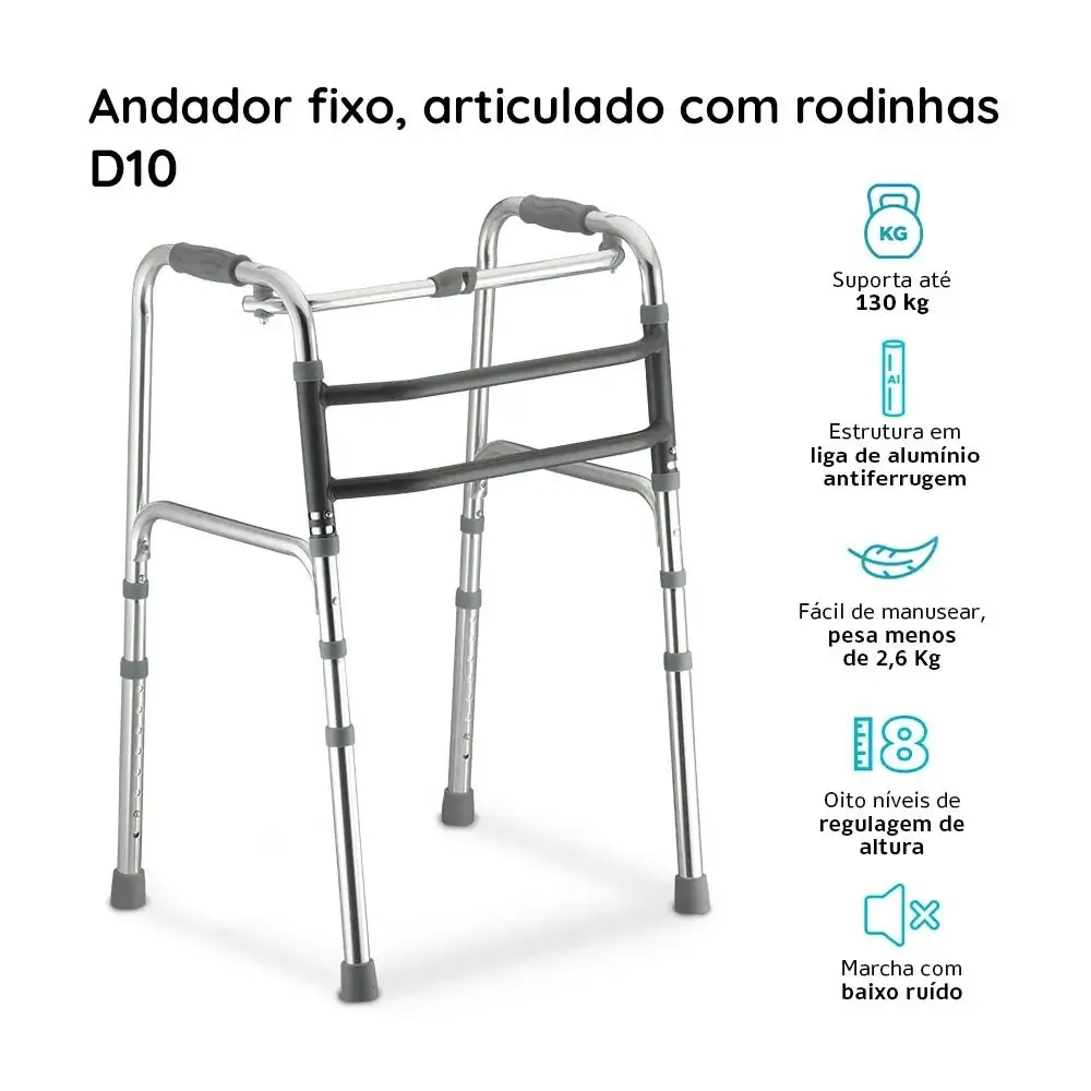 O Andador D10 Dellamed foi especialmente projetado para oferecer suporte a adultos e idosos com dificuldades de locomoção. Este modelo versátil permite ao usuário escolher entre uma marcha fixa, móvel ou articulada, proporcionando maior liberdade de movimento.