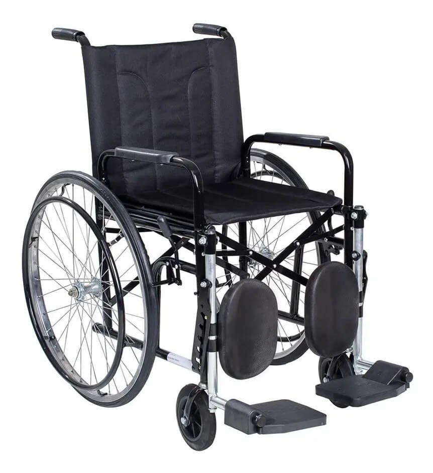 Fabricada em aço carbono, pintura epóxi, dobrável em X, assento/encosto em nylon almofadado, apoio para braços removíveis, apoio para os pés com elevação de panturrilha e regulagem de altura, freios bilaterais, aro impulsor bilateral, rodas dianteiras aro 06″ com pneus maciços e rodas traseiras aro 24″ em alumínio com pneus maciços.